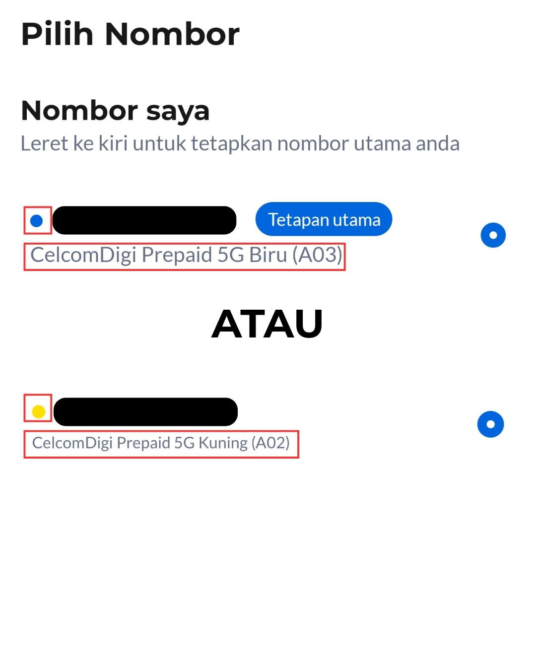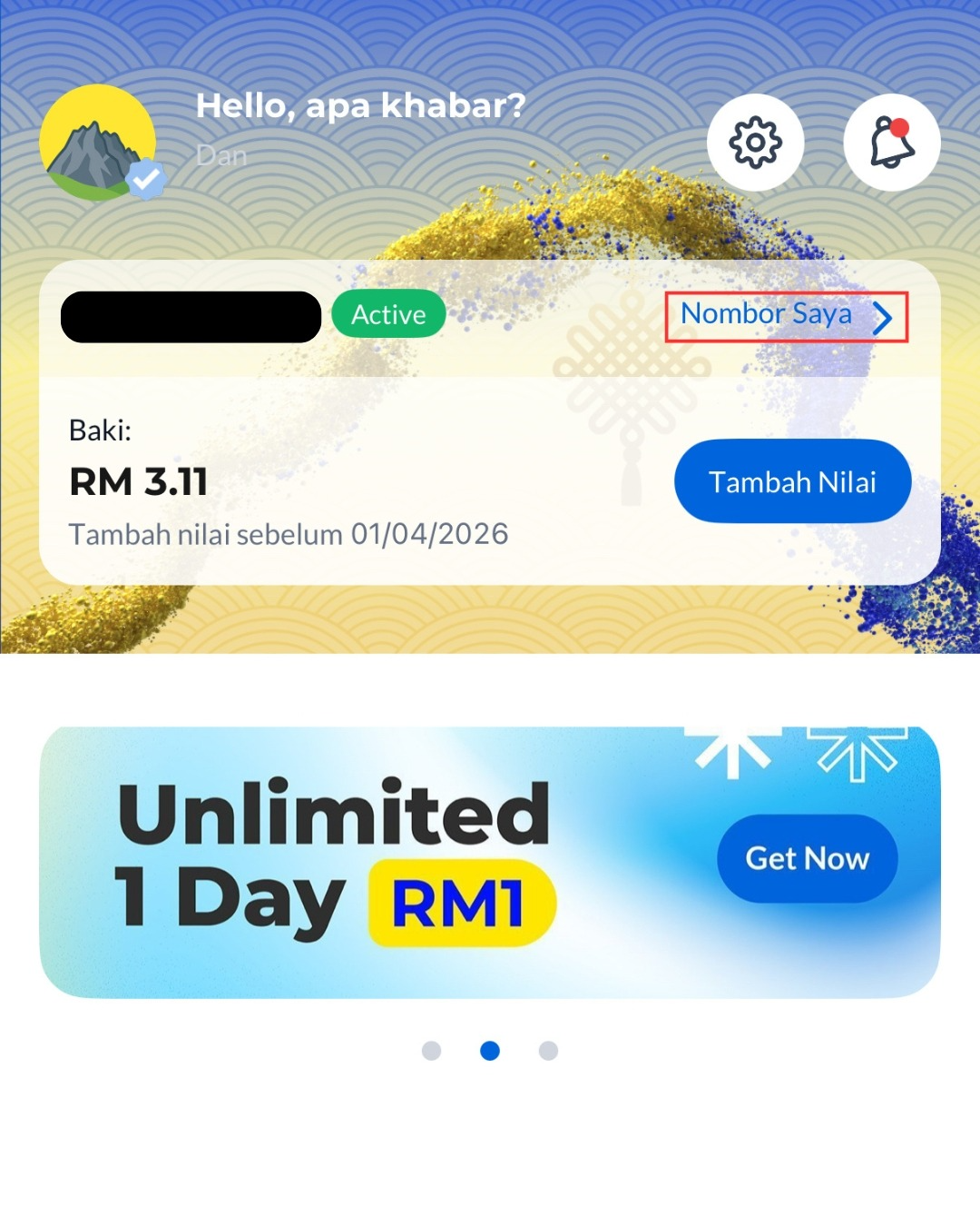Langkah 2: Nama pelan anda akan dipaparkan di sini. Jika 'Edisi Biru' dipaparkan, anda berada di bawah sistem Celcom. Jika 'Edisi Kuning' dipaparkan, anda berada di bawah sistem Digi. Dot berwarna di sebelah nombor anda juga menunjukkan sistem akaun anda: biru untuk Celcom dan kuning untuk Digi.